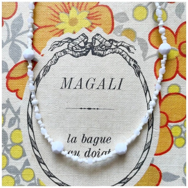 2wayネックレス ビーズネックレス ホワイト ヴィンテージファブリック巾着
