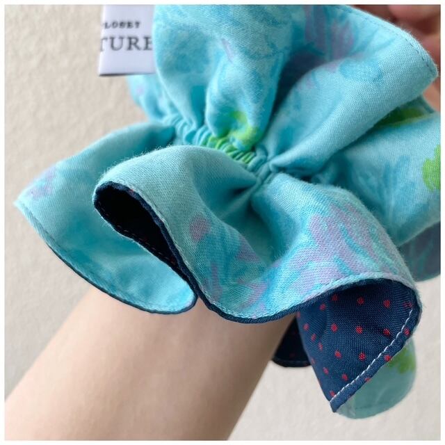 【No.24】ヴィンテージファブリックシュシュ ヘアアクセサリー リバーシブル スカイブルー ネイビー ドット