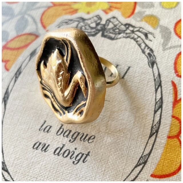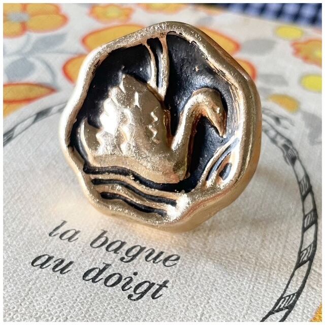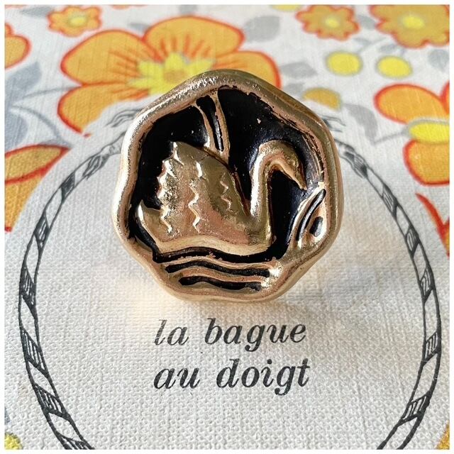 【Ring #1】ヴィンテージボタンリング 指輪 スカーフリング デザインボタン 白鳥 スワン ブラック 1点モノ