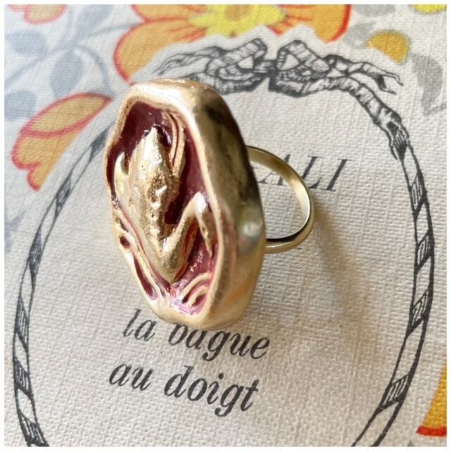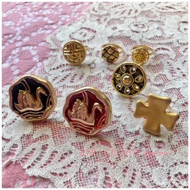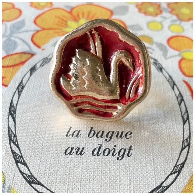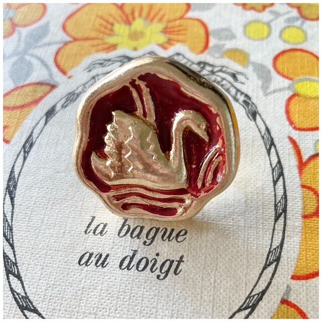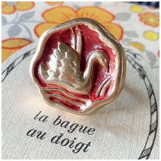 【Ring #2】ヴィンテージボタンリング 指輪 スカーフリング デザインボタン 白鳥 スワン レッド 1点モノ