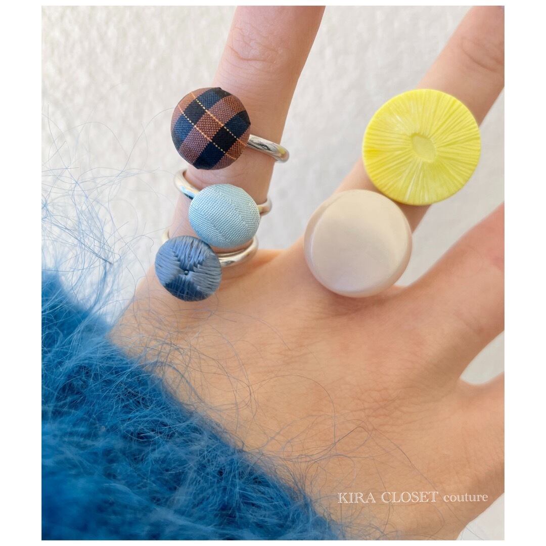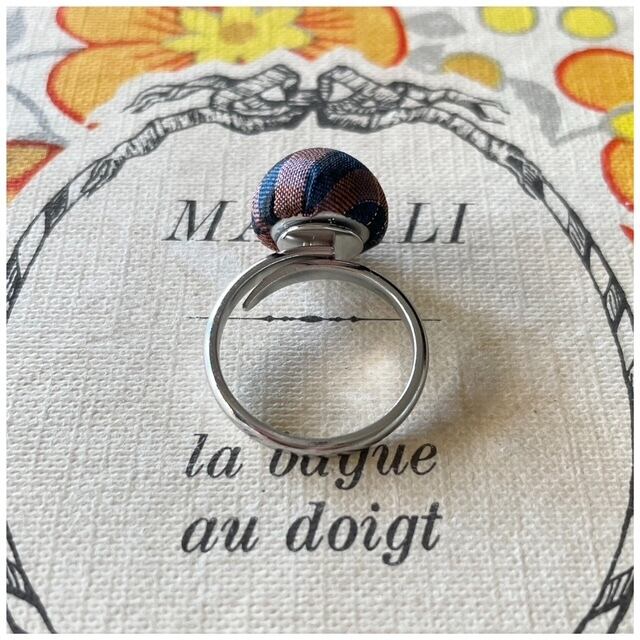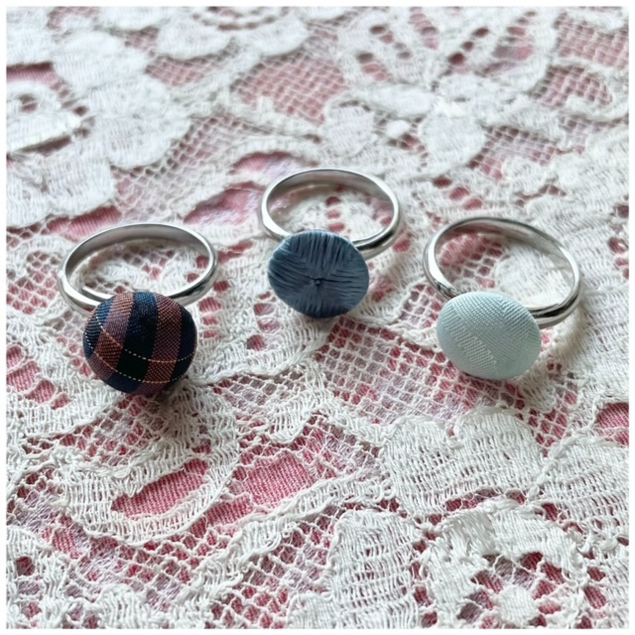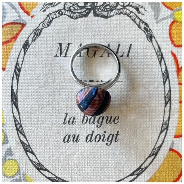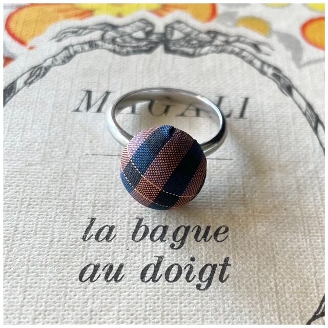 フレンチヴィンテージボタンで作ったボタンリングです。こちらは大人なカラーリングがかわいいチェック柄のくるみボタンを使用。サイズ調整できるのでお好きな指にお使いいただけます。スカーフリングとしても◎