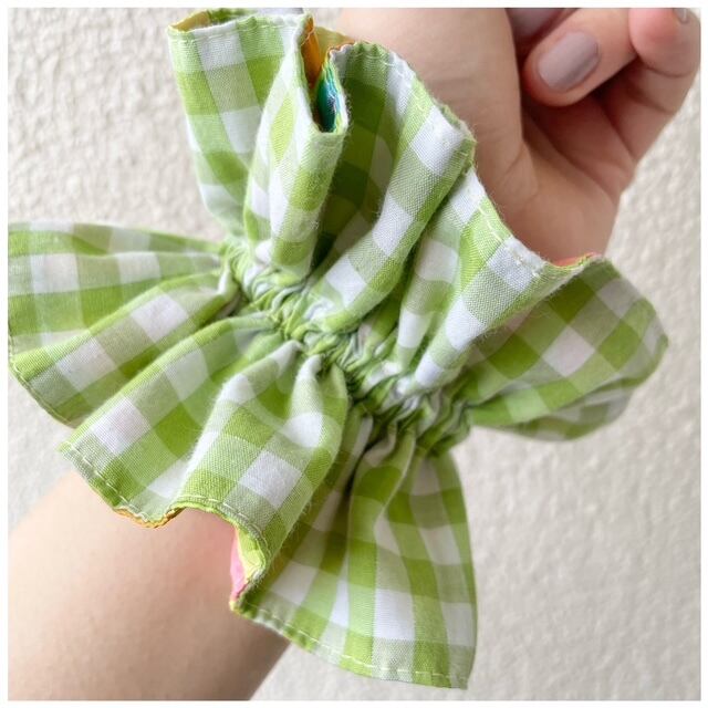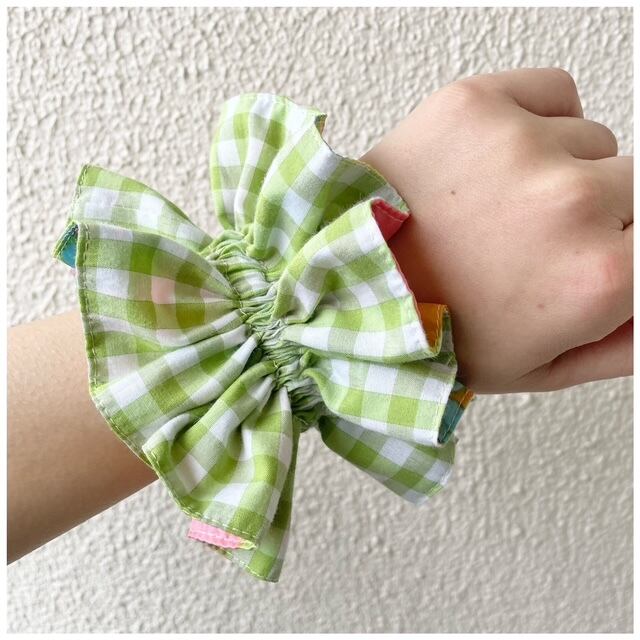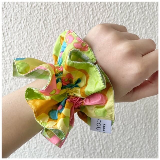キラクローゼットオリジナルのヴィンテージファブリックシュシュ。フレンチヴィンテージファブリックを贅沢に使用しましたハンドメイドの1点ものです。手首に着けると着けカフスみたいになる程よいボリューム感がグッド。異なった印象を楽しめるリバーシブルのカラーコントラストもこだわりポイントです♡