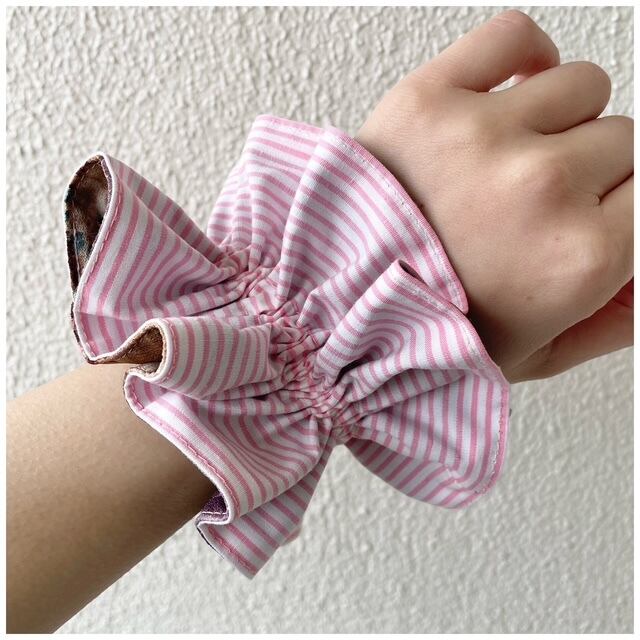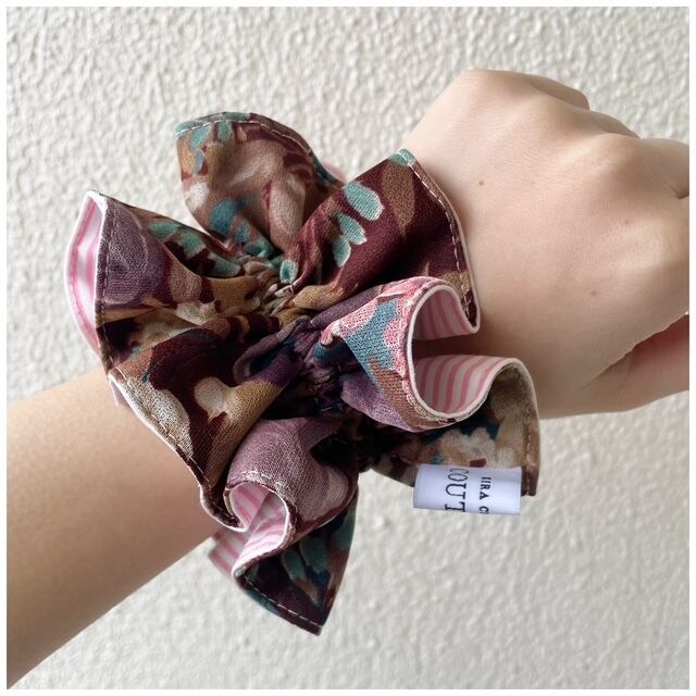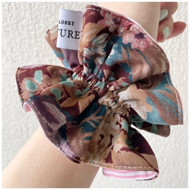 キラクローゼットオリジナルのヴィンテージファブリックシュシュ。フレンチヴィンテージファブリックを贅沢に使用しましたハンドメイドの1点ものです。手首に着けると着けカフスみたいになる程よいボリューム感がグッド。異なった印象を楽しめるリバーシブルのカラーコントラストもこだわりポイントです♡